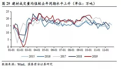 水泥产量累计同比增速下降,汽车产量同比增速上升。2019年9月,水泥产量累计同比上升6.9%,较8月份累计同比增速下降0.1个百分点。2019年9月,汽车产量累计同比下降12%,累计同比增速较8月份上升0.5个百分点,9月汽车产量当月同比增速为-6.9%,较8月下降6.3%。