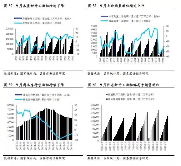 9月份基建投资累计同比增速较19年8月份上升,房地产开发投资持平。2019年9月,我国基建投资完成额累计值同比增长4.5%,较8月份上升;2019年9月,我国房地产开发投资完成额累计9.8万亿元,同比增长10.50%,与8月份持平,较去年同期上升0.6个百分点。