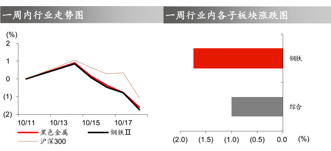 上周回顾上周沪深300跌1.08%,申万钢铁指数跌1.65%。 重点公司及动态10月14日,鞍钢股份发布2019年三季报业绩预告,预计前三季度、19Q3分别实现归母净利润17.22亿元(yoy-75%)、2.97亿元(yoy-88%);10月17日,攀钢钒钛发布公告称,拟以支付现金方式购买公司控股股东攀钢集团有限公司下属攀钢集团西昌钢钒有限公司钒制品分公司整体经营性资产及负债。