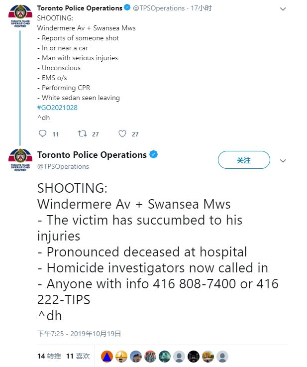原文链接:https://www.cp24.com/news/police-investigating-after-fatal-shooting-in-swansea-1.4646691https://www.cp24.com/news/police-investigating-after-highway-shooting-in-mississauga-1.4646727