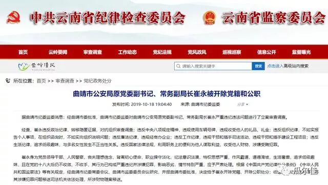 崔永身为党员领导干部、人民警察,丧失理想信念,背离初心使命,职业操守淡化,纪法意识淡漠,特权思想严重,作风霸道,道德滑坡,生活奢靡,追求低级趣味,且在党的十八大后仍不收敛、不收手,其行为已构成严重违纪并涉嫌犯罪,影响恶劣,情节特别严重,应予严肃处理。根据《中国共产党纪律处分条例》《中华人民共和国监察法》等有关规定,经曲靖市纪委常委会议、曲靖市监委委员会议研究,并报曲靖市委批准,决定给予崔永开除党籍、开除公职处分;收缴其违纪违法所得;将其涉嫌犯罪问题移送司法机关依法处理,所涉财物随案移送。