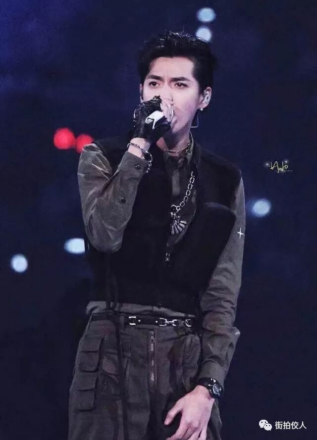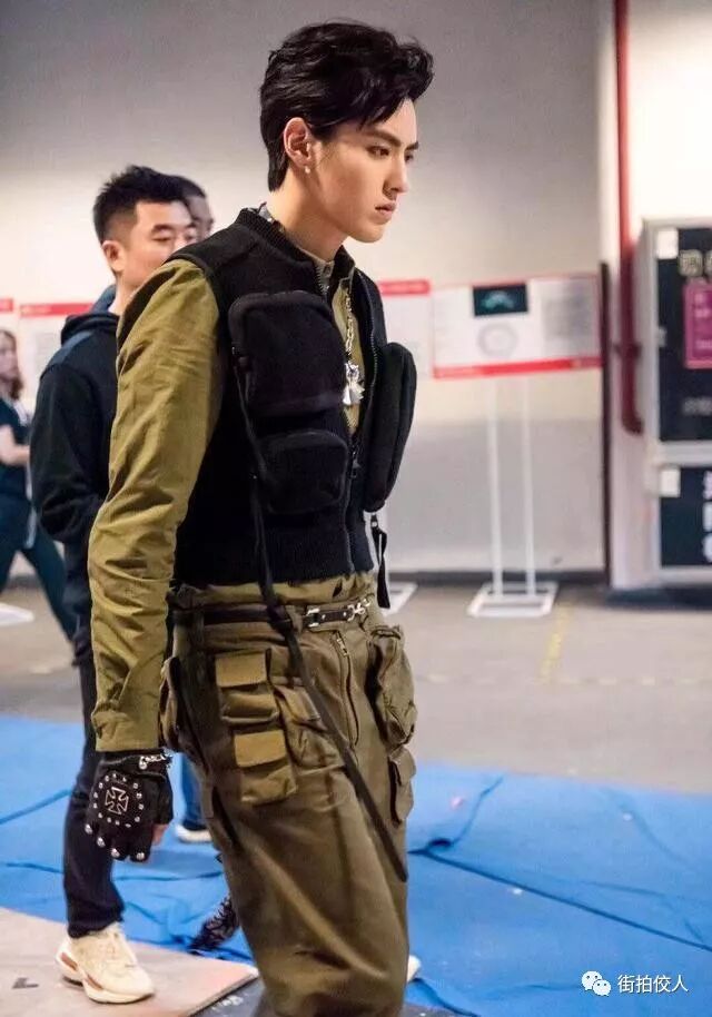 吴亦凡一身军绿色工衣装,外搭黑色夹克紧身背心,胸前大扇子项链,皮手套格外抢眼。