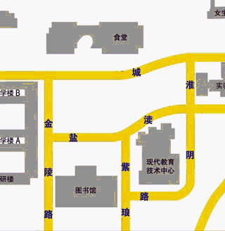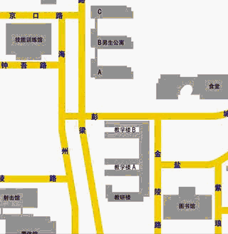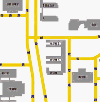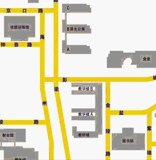在模拟街区上课的区队沿海州路西侧行走至海州路与彭城路交叉路口向东行进,过桥后沿着彭城路南侧行进至食堂南侧由西向东方第二、第三个花坛中间,往北至食堂门前解散。