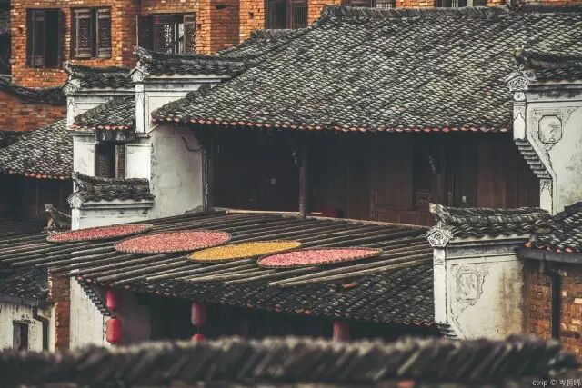 篁岭古村数百栋徽派古民居在百米落差的坡面错落有序,每当日出山头,晨曦映照,整个山间村落饱经沧桑的徽式民居土砖外墙与晒架上、圆圆晒匾里五彩缤纷丰收果实组合,绘就出世界独一无二的“晒秋”农俗景观、最美的乡村符号;