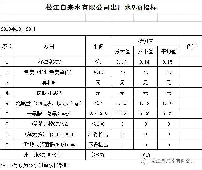 (二)上述供水水质检测值系上海市松江自来水有限公司各水厂出厂水9项指标检测结果,公布频率为每日一次。