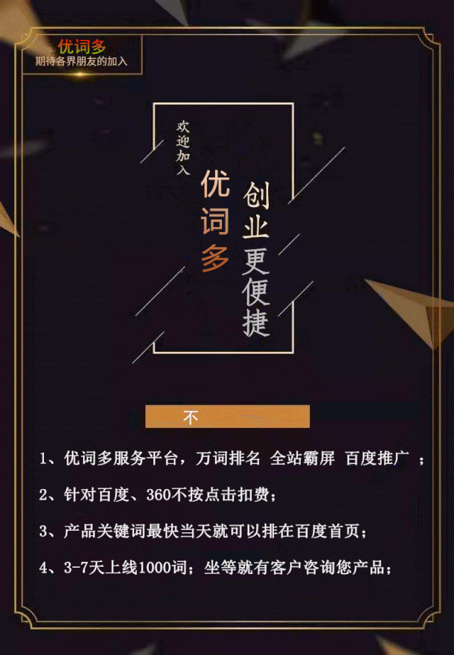 是一个全站霸屏、万词排名、推广服务的seo优化技术服务平台,不按照点击收费可3-7天将企业1000-3000以上产品关键词做到百度、360、搜狗、等搜索引擎首页,并占据首页3-6个位置,直达官网全站霸屏。公司专业联合开发的万词排名,霸屏推广关键词稳定安全排名百度首页,真正解决了客户最大网络销售问题,成功服务数全国千家客户,涵盖各行各业优词排名推广,积累案例数不胜数,为于各个行业的销售渠道多一份稳定的客户来源。