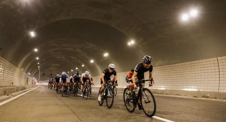 骑友王康迪:这条路上的隧道也太牛了!离起点不远处的渔寮隧道全长5.86公里,以40KM/H的均速骑,我差不多花了9分钟才骑出隧道。