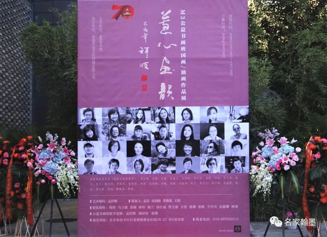 “蕙心画韵——M3公益书画班国画/油画作品展”,是M3公益绘画班学员阶段性成果展。M3美术馆坐落在北京碧水庄园内,其公益绘画事业由著名艺术家孟祥顺先生创立,由其亲自义务授课,孟祥顺先生在教学中秉承“守护传统 守护经典”的教学方针,同学们在其两年来的指导下,涌现出了很多精品画作。此次展览共展出国画班同学临画弘仁、八大山人、倪瓒、石涛、黄宾虹等的习作;油画班临摹印象派大师莫奈、西斯莱、雷诺阿、塞尚、德加、梵高等的习作共两百余幅。到场的专家一致认为,此次展览展出学员作品追寻前人足迹,学习经典画法,体现了学员们扎实的基本功和各自鲜明的风格特点。此次参展学员有:马立婕、王倩、方堃、王淑兰、王雪枝、汤红丽、刘妍、许玲、吴文莉、杨兰、张兰、张汉华、李好月、张秀芳、杨健、沈润梅、李敏、杨旗、沈蕴珂、林卫、周天红、单沙林、尚瑞霞、钟铃、贾玉雁、徐鸿、曹雅薇、黄颖。蕙心画韵画展正值新中国成立70周年之际,M3美术馆借此展览向伟大祖国母亲致敬,也是孟祥顺先生致力于艺术服务大众的大爱情怀的体现。