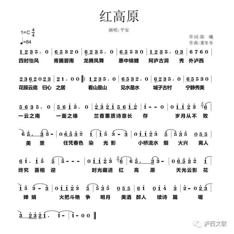 歌曲《红高原》是为云南省红河哈尼族彝族自治州泸西县而创作的。由作词家陈曦作词,著名作曲家、影视音乐人董冬冬作曲,著名歌手平安演唱。歌词有文化内涵、有古典诗意,把云南、泸西、红高原、城子古村这些地域文化、秀美风光都“唱”了进去,以朗朗上口的歌词、优美的旋律、纯净的音色、唯美的画面、隽永的意境,再现了勤劳善良的泸西各族儿女在党的领导下逐梦发展、破浪前行的奋斗过程。