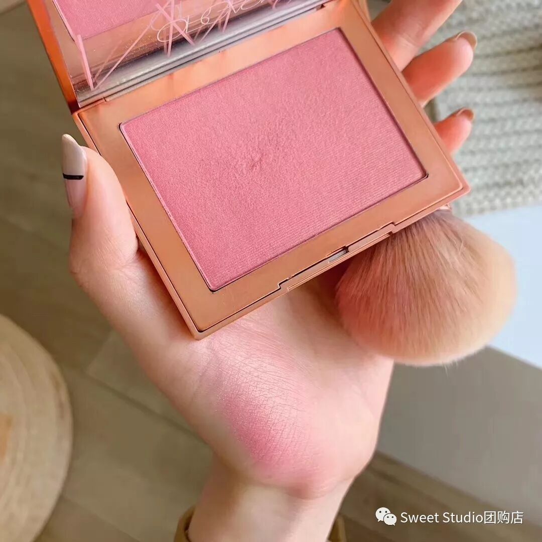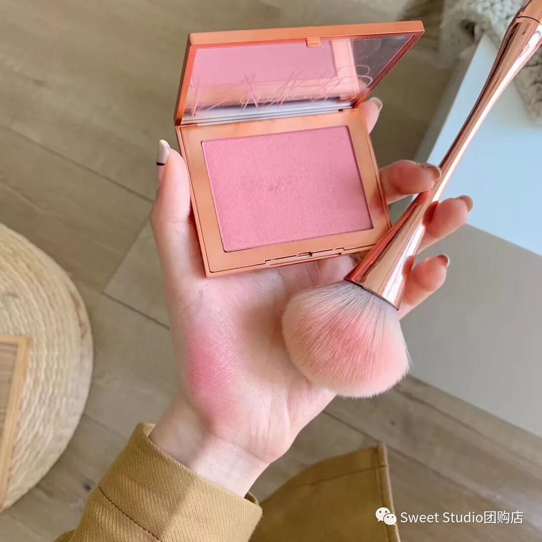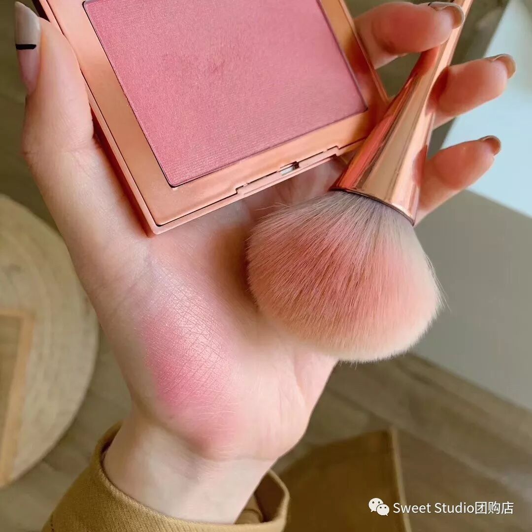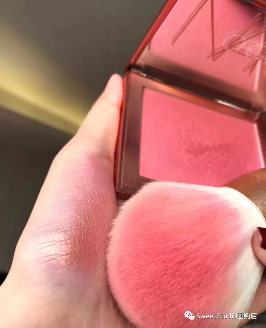 肉眼看起来是蜜桃粉 但是在阳光下就能看到金色的偏光 感觉可以算是腮红+ 玫瑰金高光的组合 两个用处