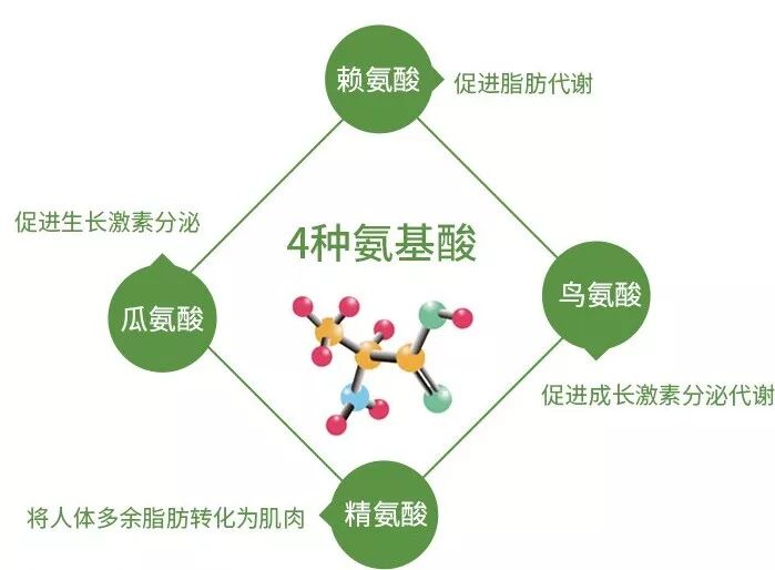 4种氨基酸成分促进夜间生长激素分泌,加快脂肪消耗;还能改善浮肿,排出体内多余物质,把多余脂肪转化为肌肉,最终达到塑形的目的~