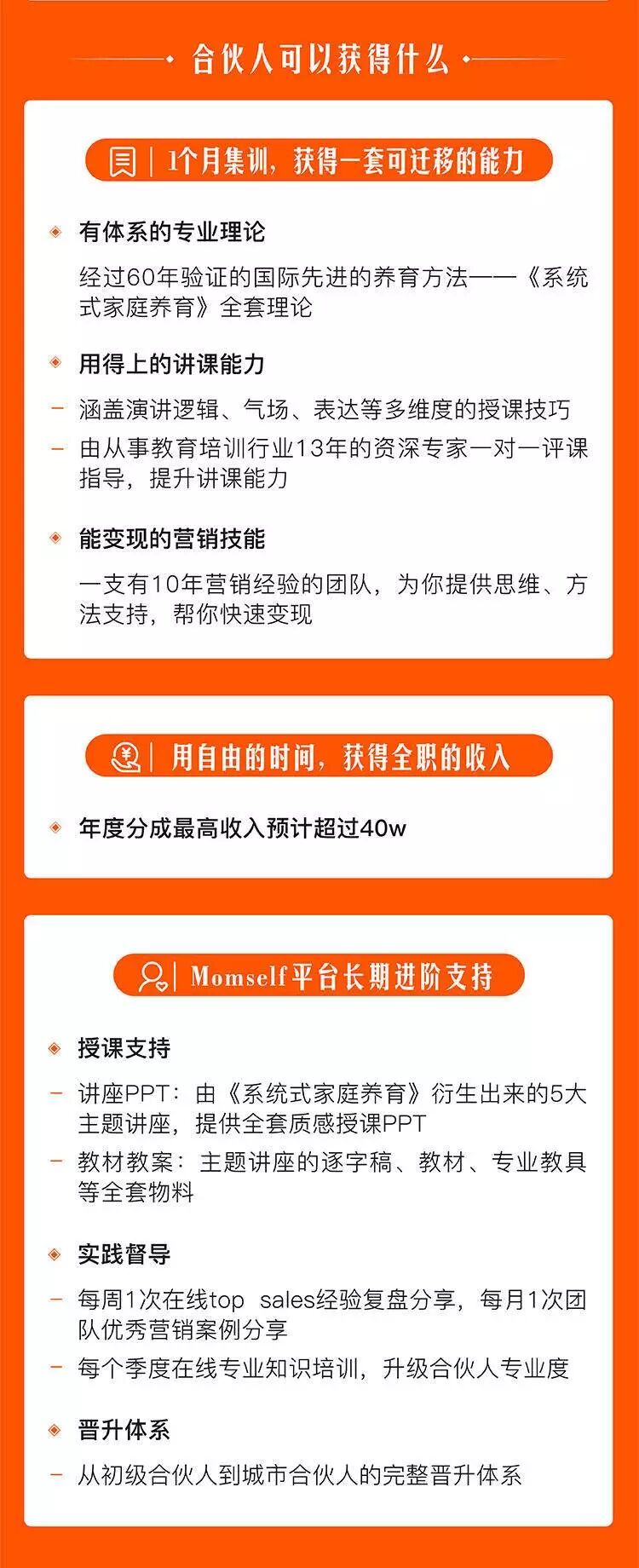 Momself 推出的「合伙人计划」就是这么一件事,它以系统式家庭养育为主要学习内容,在学习达成后,把这套家庭养育方法再推广给更多有需求的妈妈。 这就是Momself合伙人计划的唯一目标:让妈妈的养育经验值变现。 而且,它还解决了摆在每个妈妈面前的难题:平衡家庭和事业。 这份计划让这种平衡成为可能:参与的妈妈既拥有自己的时间,又可以有全职的收入。很少有一份工作既可以满足经济需要,又满足情感需求,但成为合伙人后,这件事成为了可能。 和其他事业不同,这件事并不需要你从零开始学起。 如果你拥有活跃的妈妈社群;如果你喜欢表达和分享;如果你拥有某个领域的专业知识;如果你喜欢同好社交……这些都会成为Momself合伙人的加分项,变成你的收益。