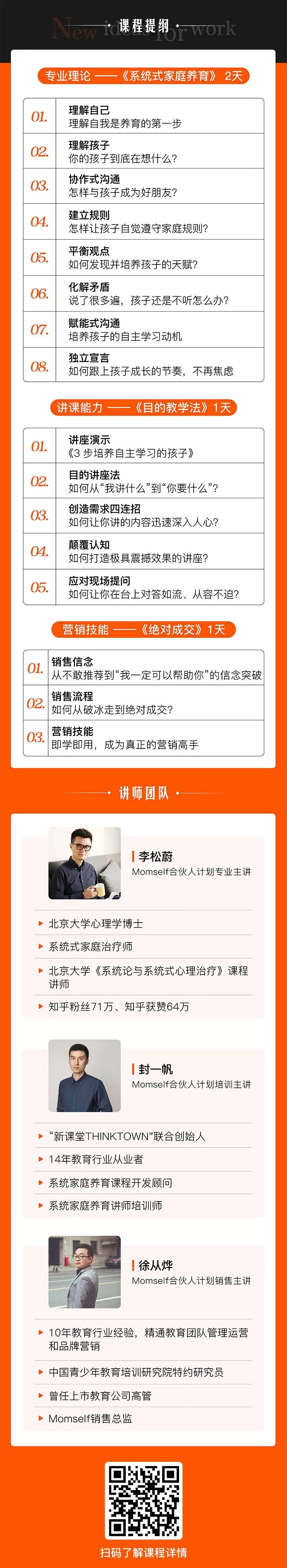 你不用害怕学不会。 多轮测试数据显示了Momself培训体系的有效性。参与内测的学员经过专业培训和一对一指导,80%以上都具备了独立讲课能力。 你不用害怕没效果。 《系统式家庭养育》经60年验证,帮助了200万中国妈妈,有效性毋庸置疑。解决自己的养育问题,同时帮助他人,价值感飙升。 你不用害怕做不到。 北京大学心理学博士、系统式家庭治疗师、北京大学《系统论与系统式心理治疗》课程讲师、知乎大V 李松蔚老师亲自授课。 「新课堂THINKTOWN」联合创始人,14年教育行业从业者,讲师、培训师,十年研究和实践讲授技巧,累计培训了1000多名专业讲师的封一帆老师,进行一对一评课指导。 前上市教育公司高管,Momself销售总监徐从烨,带领合伙人实现信念突破,掌握销售技巧。 Momself把这些专业人士的所有经验、知识,汇聚在一起,为妈妈们搭建了完整的「成长体系+变现路径」: