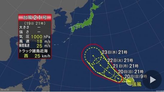 昨日(19日)午後9時、日本のはるか南で台風21号が発生しました。気象庁の観測によりますと、昨日(19日)午後9時、日本のはるか南のトラック諸島の海上で、台風21号が発生しました。