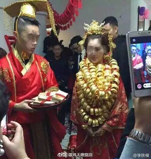6月12日,有自媒体人曝光了一组新婚图,配文:“广东中山三乡镇的一场婚礼”,照片中,莫名有一种灵异感,新浪穿着成继承皇位,新娘穿金戴银很豪气,但是迎亲队穿的却是清兵服,特别灵异瘆人。