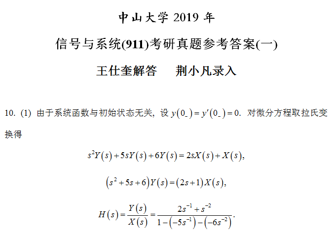 首先感谢提供试卷的同学!上乘的试卷考查分析问题的能力,下乘的试卷考察计算能力,这套试卷的质量属于下下乘。最后三题连平时的作业题难度都不如,第10题要求画框图,只有不学无术的老师出题才要求画框图,框图和流图完全等价,而流图简洁得多,为什么不画流图呢?整套试卷没有一道题值得称道,全是烂题。从试卷质量可以看出中山大学的电子信息很弱,跟重邮一个档次,比南邮、东大差得远。