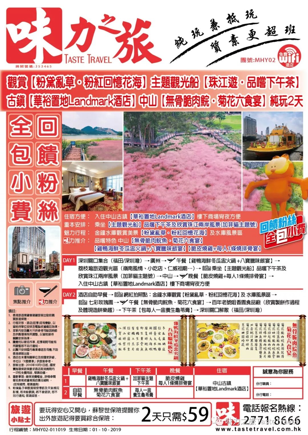 古镇【华裕置地Landmark酒店】中山【无骨脆肉鲩.菊花六食宴】观赏【粉黛乱草.粉红回忆花海】【游珠江.品嚐下午茶】纯玩2天