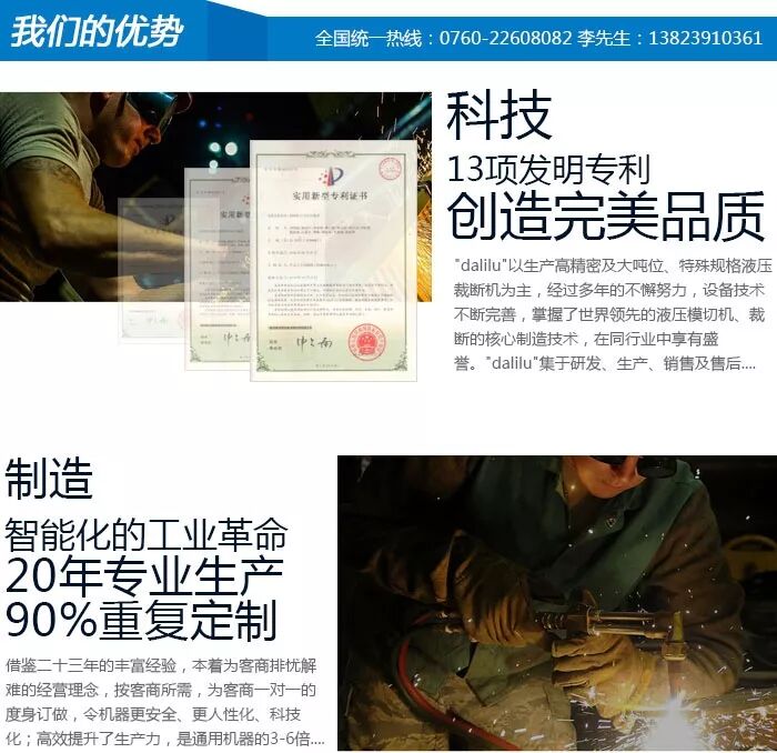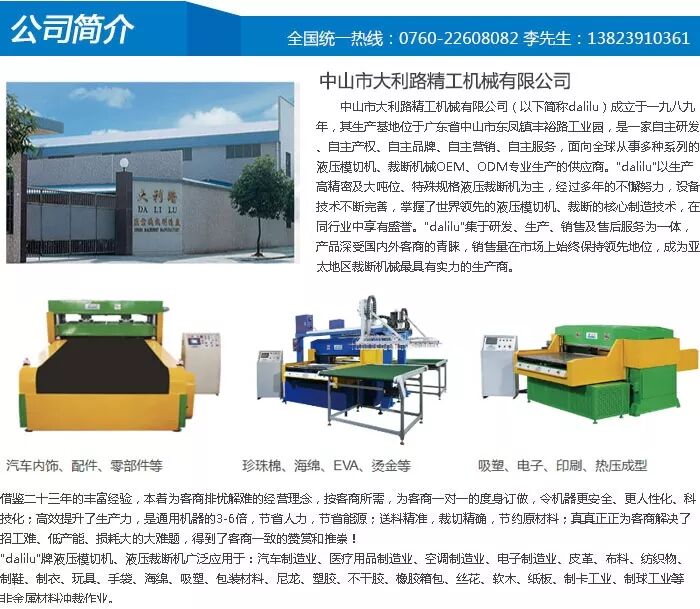 中山市大利路精工机械有限公司(以下简称dalilu)成立于1989年,裁断机,其生产基地位于广东省中山市东凤镇丰裕路工业园,是一家自主研发、自主产权、自主品牌、自主营销、自主服务,面向全球从事多种系列的液压模切机、裁断机械OEM、ODM专业生产的供应商。
