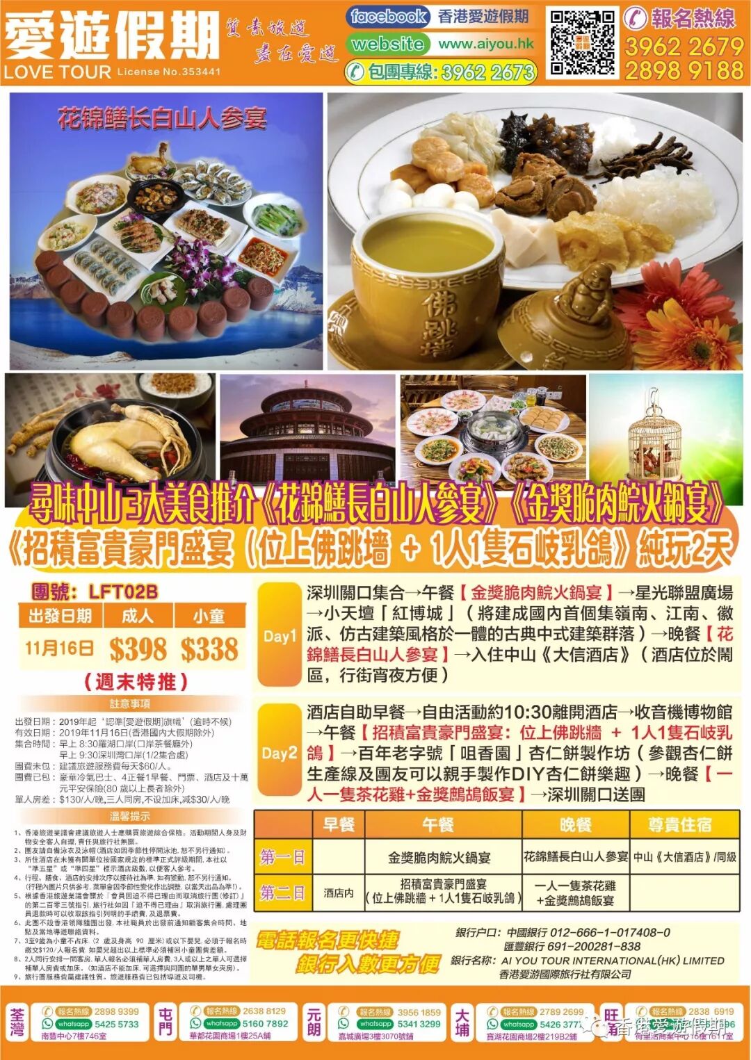 美食佳餚:金獎脆肉鯇火鍋宴、花錦鱔長白山人參宴、招積富貴豪門盛宴(位上佛跳牆 + 1人1隻石岐乳鴿)