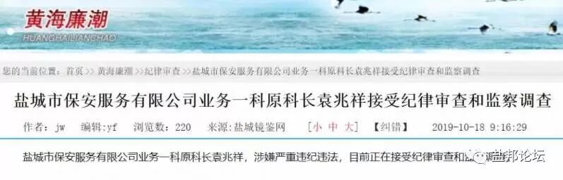 1、盐城市保安服务有限公司业务一科原科长袁兆祥接受纪律审查和监察调查;