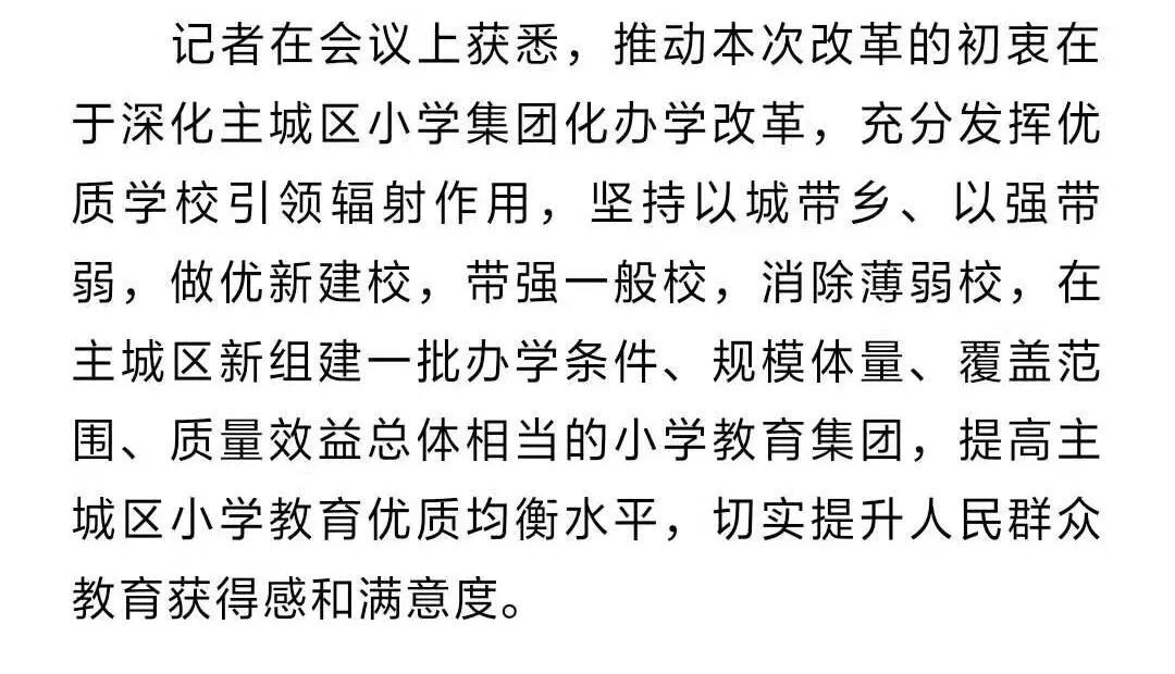 10月19日下午,我市主城区深化小学集团化办学改革推进会在市教育局召开。在当天的会议上,我市教育部门将主城区城乡77所公办小学,新组建为20个小学教育集团。