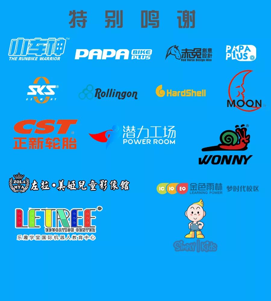 赛事支持方:PAPA BIKE、Rollingon、SKS、Hardshel、赤兔文化、星贝丽儿、佛山市顺德区跨速头盔有限公司、福建省华菲皮革制品有限公司 、厦门正新橡胶工业有限公司、乐趣学堂、金色雨林梦时代校区、左拉美娅儿童影像
