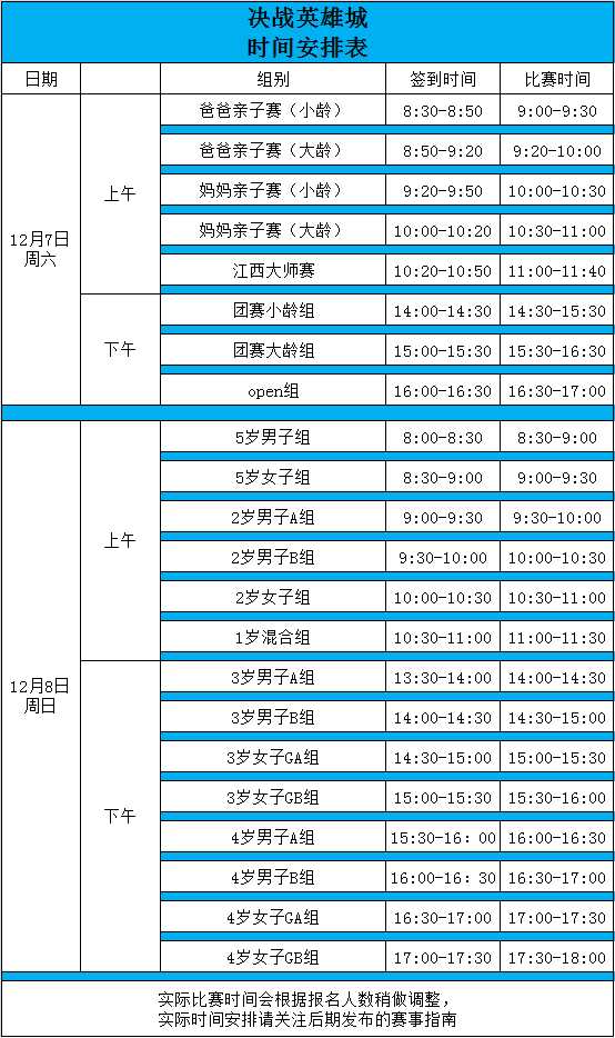 *每个年龄组不满10人即与同年龄组进行并组,如男子B组未满10人会与男子A组合并,女子AG组未满10人,会按年龄分到女子BG组内,A/B/G各组都未满10人,合并为1组比赛;
