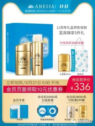 安热沙资生堂小金瓶防晒霜+防晒喷雾,原价476元,促销活动价386元,领10元独家券,付定金立减40,到手价336元。