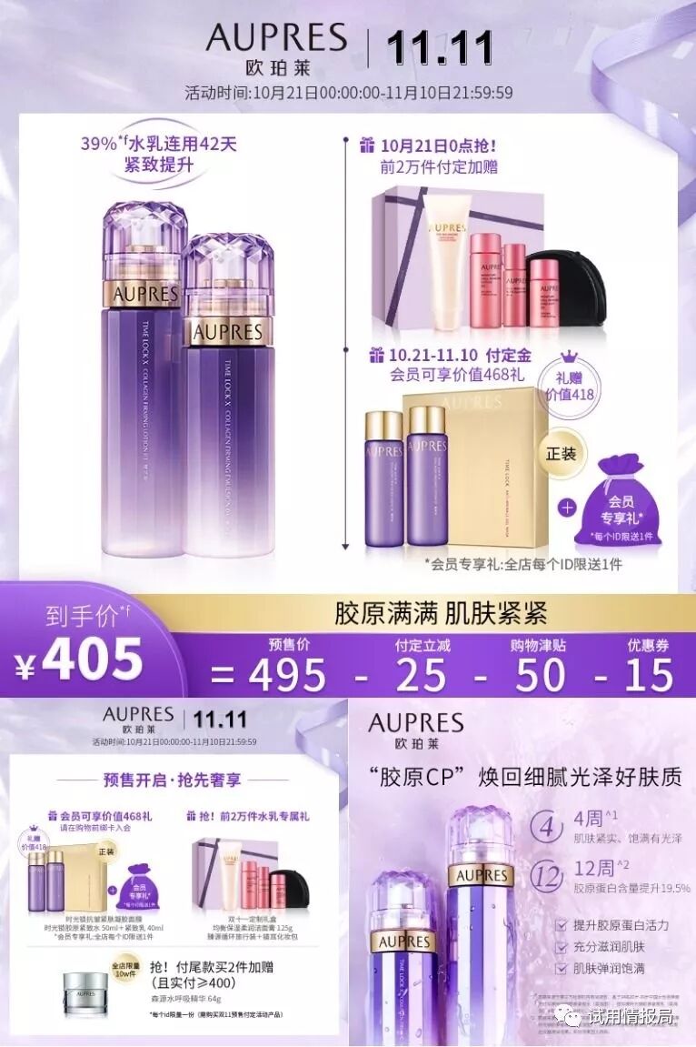 【欧珀莱】时光锁胶原紧致滋润保湿水乳,原价495元,领券15元,购物津贴50元,付定立减25元,到手价405元。