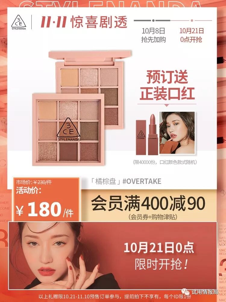 韩国3CE九宫格眼影盘9色,原价230元,促销活动价185元,领5元独家券,券后【180元】包邮秒杀!