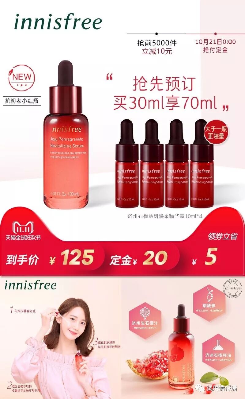 【悦诗风吟】红石榴精华露套装,原价170元,促销活动价150元,领5元优惠券,10月21号付定金20元,11月11号前5000件尾款立减10元,到手仅125元,加赠小样10ml*4