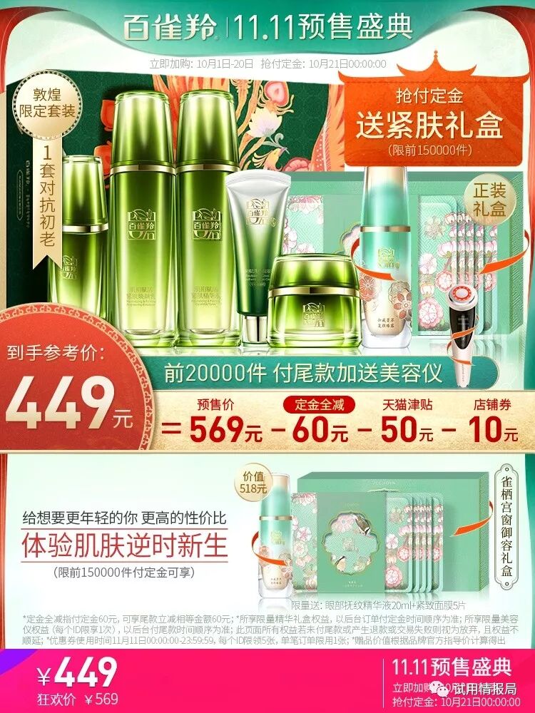 百雀羚肌初赋活抗皱紧致护肤品套装,原价896元,促销活动价446元,领30元独家券,定金立减60元,到手【356元】包邮秒杀!