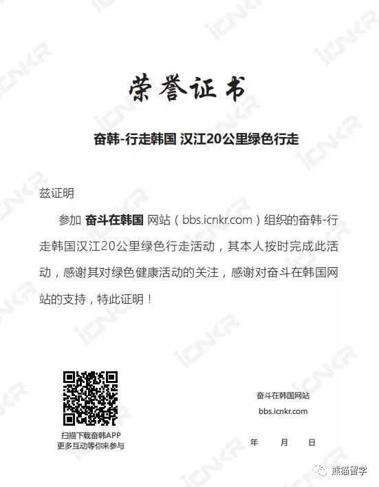 为绿色行动担当志愿者的同学们,奋韩将会提供奋韩徒步,绿色行走志愿者荣誉证书
