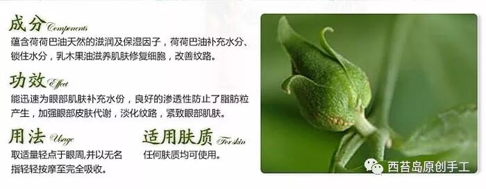 成分:矿物质、维生素、蛋白质、胶原蛋白、植物腊、Mytidyic Acid特质:呈黄色、萃取自荷荷芭豆。非常滋润、无任何味道、且油质较轻滑似脂腺分泌的油脂。荷荷芭是一种沙漠植物,如南加州、亚利桑纳州、以色列、澳洲等地区均有生产。具有高度稳定性,能耐强光,高温而保持结构不变,是可以久藏的油。