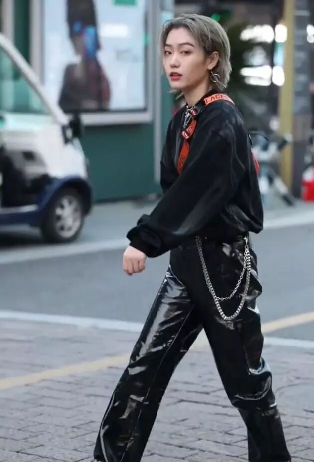 最让人觉得她特别潮的,还是她身上这条裤子了,这条裤子看起来像是被她涂了1000瓶指甲油上去,不然怎么会这么亮,这么有光泽呢?其实她这条裤子并不是真的用指甲油涂过,只是一条漆皮皮裤而已。