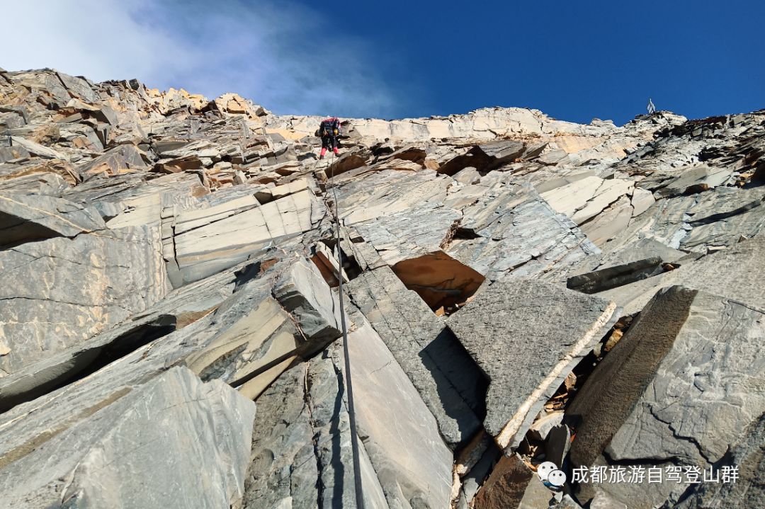 三峰攀登的最后一段石壁,会感觉坡是垂直的,心理上会产生压力。这个石壁会由攀登队长先行上攀,固定好路绳后登山者借助上升器攀登,石壁不光滑,有很多可以借力的地方,要注意三峰风化很严重,上攀和下降的时候都要注意落石,更不要制造落石,头盔一定要戴好不可以摘下。