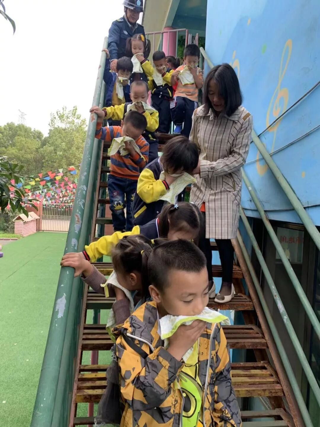 ? ? ? 10点整,火警警报响起。孩子们的第一反应是慌张。但很快在各班老师的组织引导下,迅速取下毛巾,打湿,捂鼻,紧然有序排队,从安全通道准备撤离。我们的保安叔叔也在第一时间,快速进入幼儿园内,辅助老师们帮助孩子们撤离,到安全的指定场地。