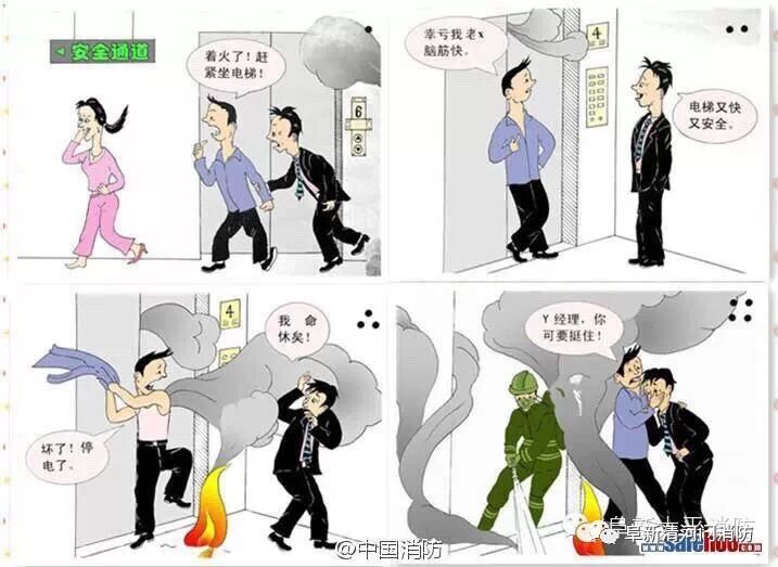 if (!window.__second_open__) { document.getElementById('js_image_desc').innerHTML = "不能轻易乘坐电梯疏散的原因:一是发生火灾后,往往容易断电而造成电梯“卡壳”,给救援工作带来难度,影响及时疏散。二是电梯直通楼房各层,火场上烟气涌入电梯通道极易造成“烟囱效应”,人在电梯里随时会被浓烟毒气熏呛而窒息死亡。".replace(/\r/g,"").replace(/\n/g,"