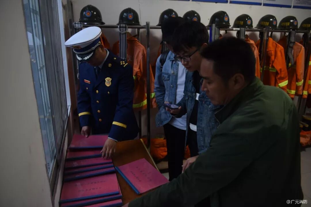 在社区负责人的带领下实地参观了车库、器材室和值班室等功能库室,查看消防设施设备、装备建设,了解了他们日常工作开展情况。