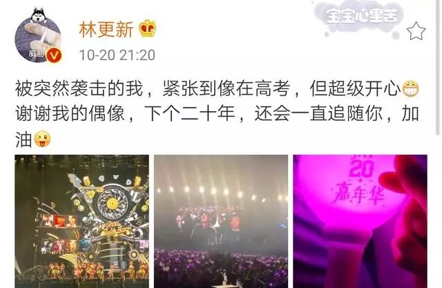 10月20日晚上,林更新更博,分享了自己看周杰伦演唱会的照片,并兴奋地感慨道:被突然袭击的我,紧张到像在高考,但超级开心,谢谢我的偶像,下个二十年,还会一直追随你,加油!