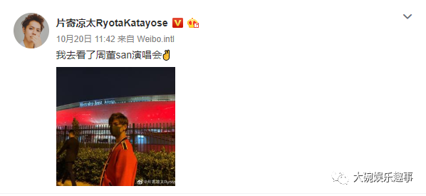 曝光了一组在周杰伦演唱会上偶遇日本男星片寄凉太的照片。10月20日,片寄凉太本人也在个人社交账号分享了一张现身周杰伦演唱会的照片,并配文“我去看了周董san演唱会”。