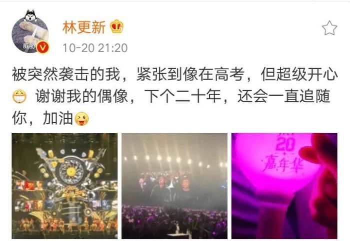 周杰伦的才华也是受到了不少圈内艺人朋友的青睐,就连林更新也是周杰伦的粉丝。此次周杰伦的上海站演唱会,林更新也开启大型追星现场,林更新戴着鸭舌帽,还挥起了荧光棒,非常低调。不过林更新还是被主办方认出来,被cue点歌,林更新在点歌时,林更新见到偶像更是紧张到结巴,磕磕巴巴在现场点了一首《世界末日》,非常逗趣。