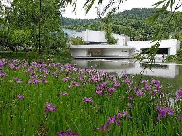 那年晓风书屋入驻了西湖边上的中国丝绸博物馆,成为了一道独特的文化风景线。她坐落于池塘边上,为周边绿树所掩荫,靠水的连廊宛如润滑的丝绸在池水之上铺展。池中植有绿荷,池上架有拱桥,池边辟有园圃。