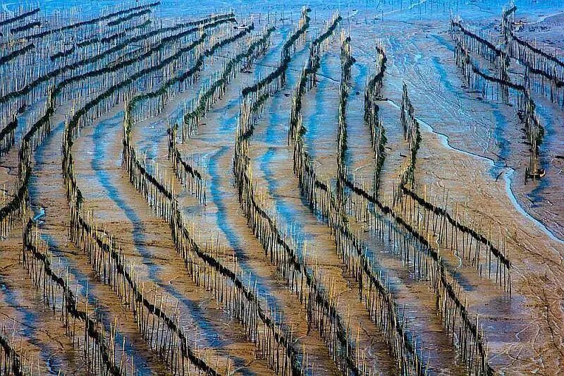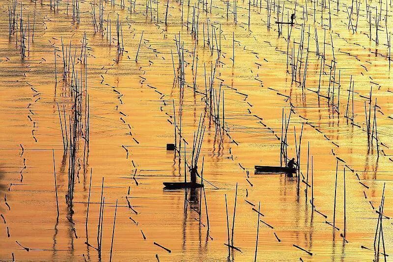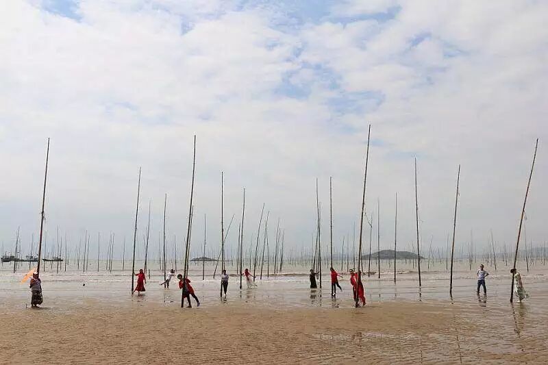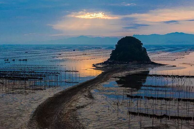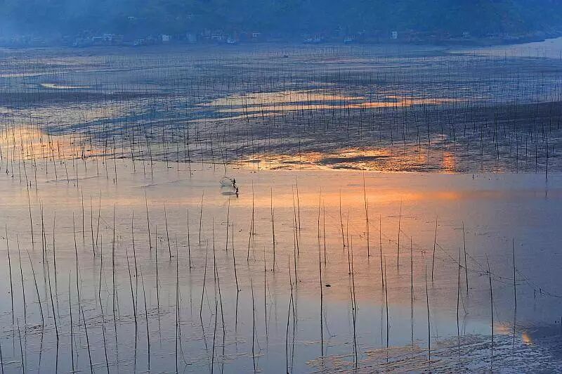 沙江村位于霞浦县城偏西20公里,村边海面波光粼粼的滩涂,密密麻麻插滿了用来晾晒紫莱的竹竿,留给船行的水道,形成优美的s形线条,居高远眺,浓淡相宜、文静雅致,大小船儿穿梭其间,构成梦幻般的画面。