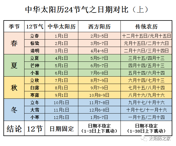 1?“月日系统”及“节气系统”与太阳黄经保持固定,不再“上蹿下跳”,并与西方阳历之日期实现了永久性的一一对应。例如,中华太阳历8月27日为“中华人民共和国国庆节”,这一天永远对应西历10月1日。