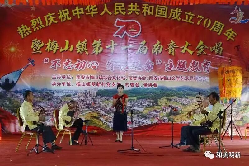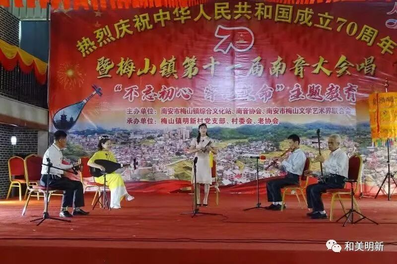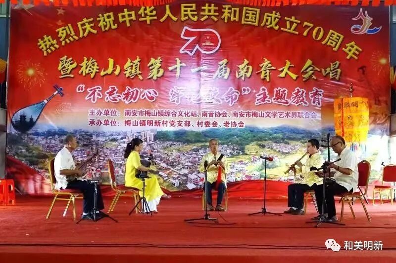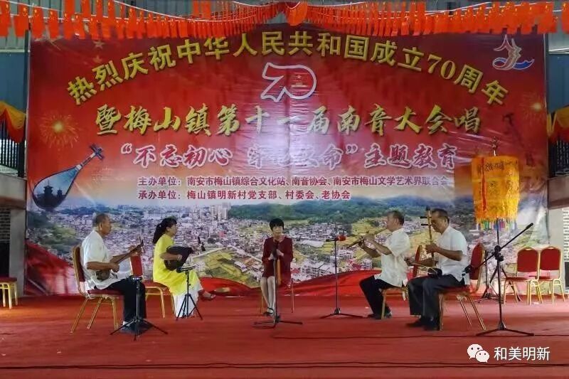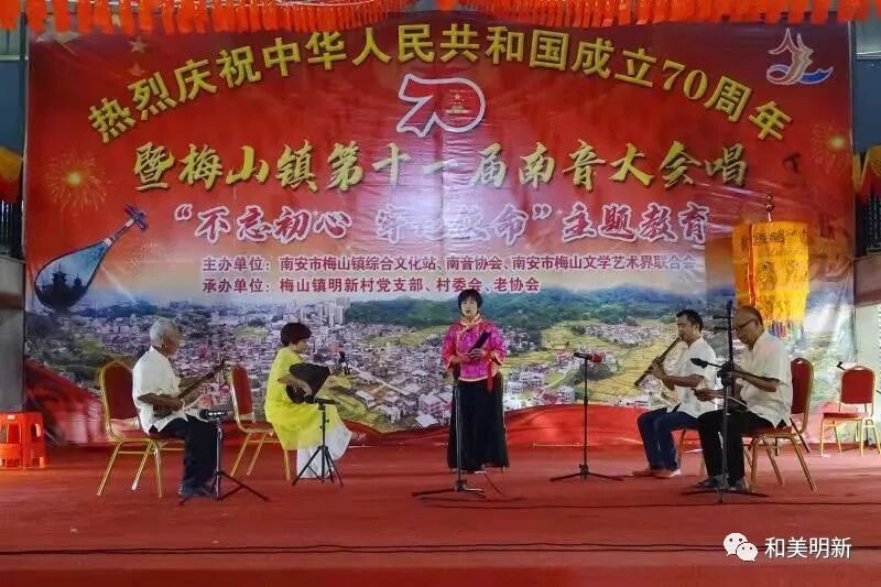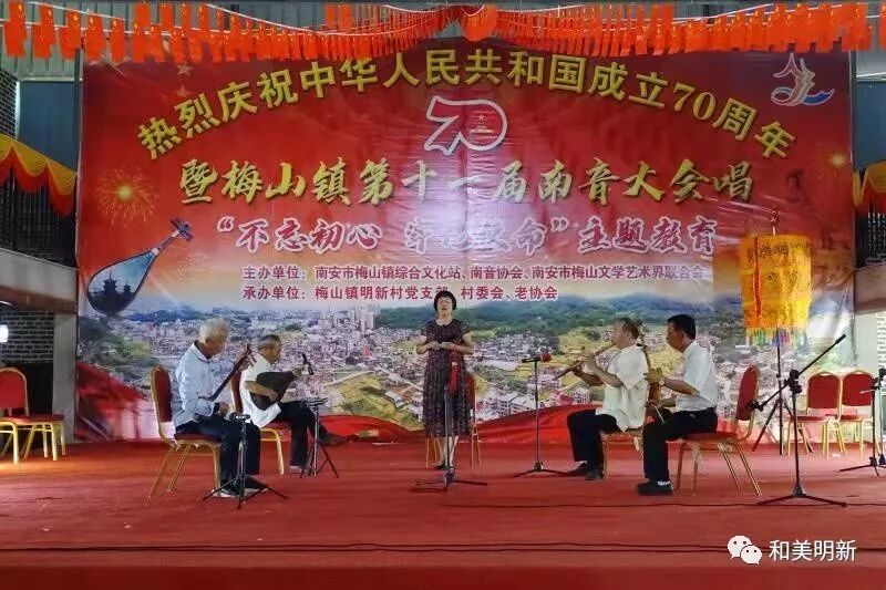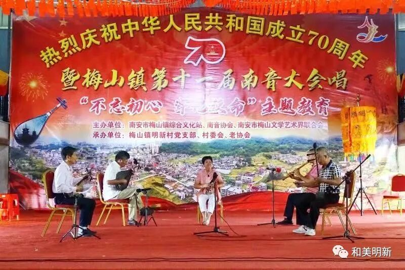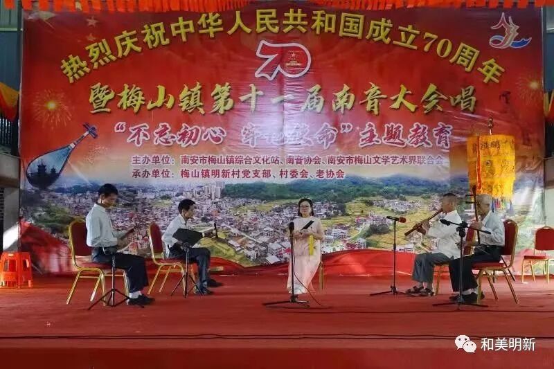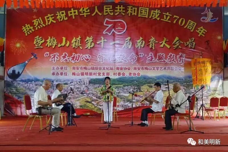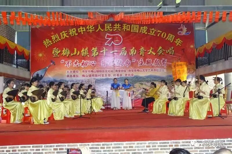千年南音,尽显非遗魅力;古乐盛会,牵动浓浓乡情。2019年10月20日,在明新村聚缘山庄隆重举行庆祝中华人民共和国成立70周年暨梅山镇第十一届南音大会唱“不忘初心,牢记使命”主题教育活动,该活动主办单位:南安市梅山镇综合文化站、南音协会、南安市梅山文学艺术界联合会;承办单位:梅山镇明新村党支部、村委会、老协会。