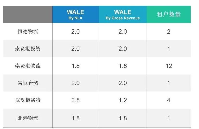 当资产所有租户租金单价均一致时,租金WALE与租期WALE是等同的。这种情况会出现在整租型项目或者物流园区中。物流园区租户租金单价差异极小,如在新加坡上市的运城网通信托资产包中的物流项目NLA WALE和Gross Revenue WALE大部分均是等同。上图凯德商用信托资产包中,凯德二七广场应为华联整租项目,故其WALE较长且均是7.9年。