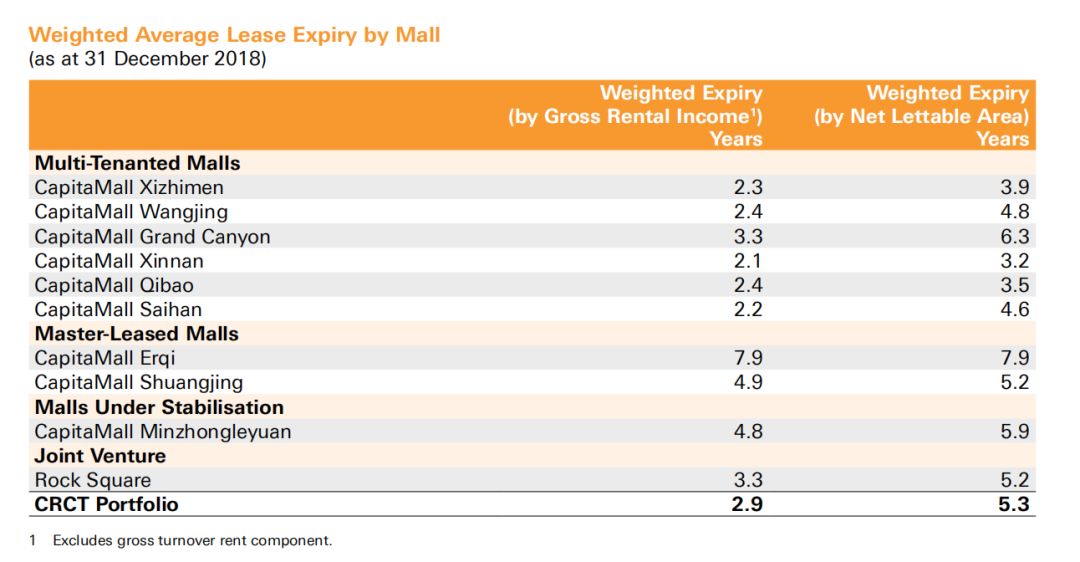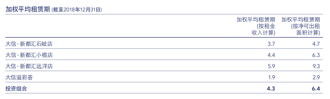 租期是商管和租户商务条件博弈中一个重要指标。对于购物中心租户而言,前期装修成本投入高,更长的租期有利于成本回收和盈利,而对于商管方而言,租期意味着调整主动权。在REITs年报中有一个必备分析指标-加权平均租赁期。这个指标便是租期的量化指标。