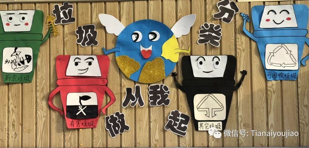 装饰环境布置方面:我园各班在室外墙壁与幼儿一同设计垃圾分类环保题材的主题环创,从而使幼儿在参与制作过程中得到启迪培养幼儿的环保意识。