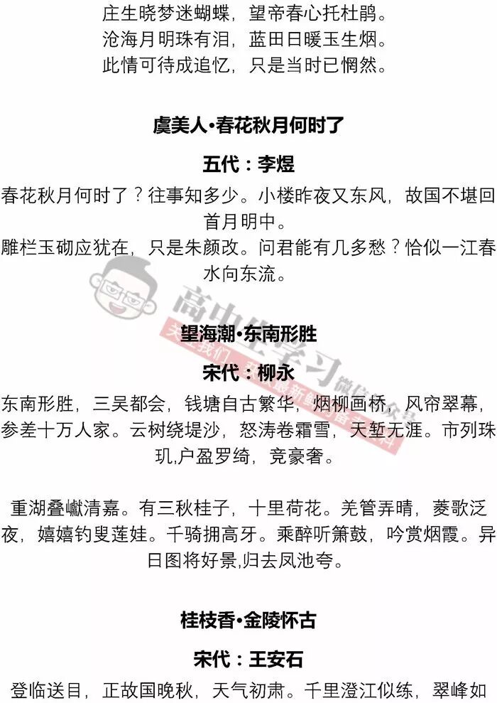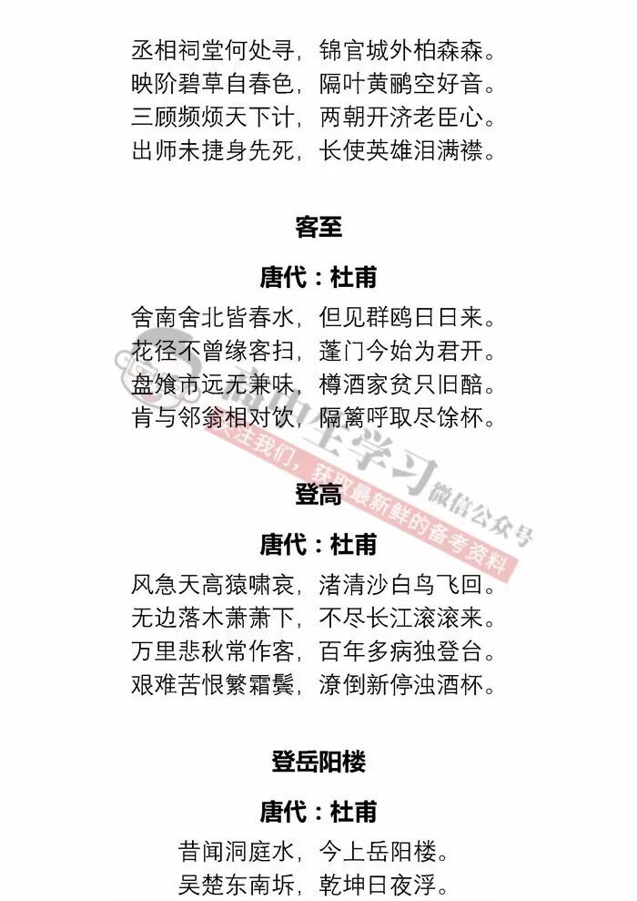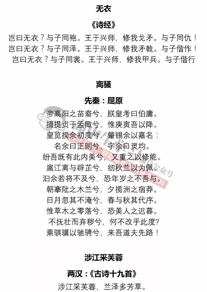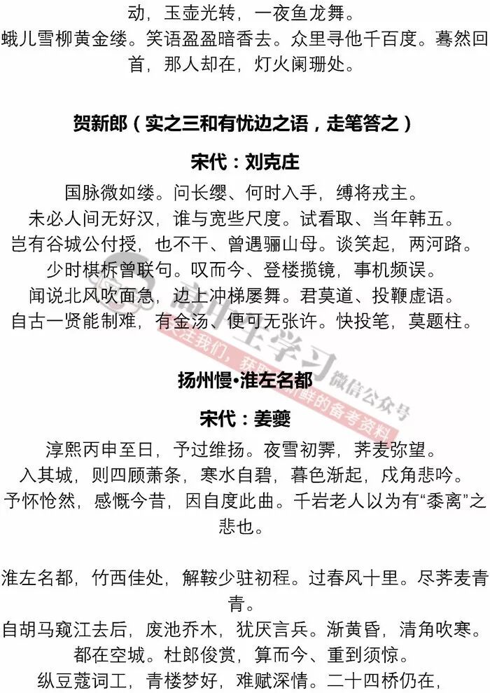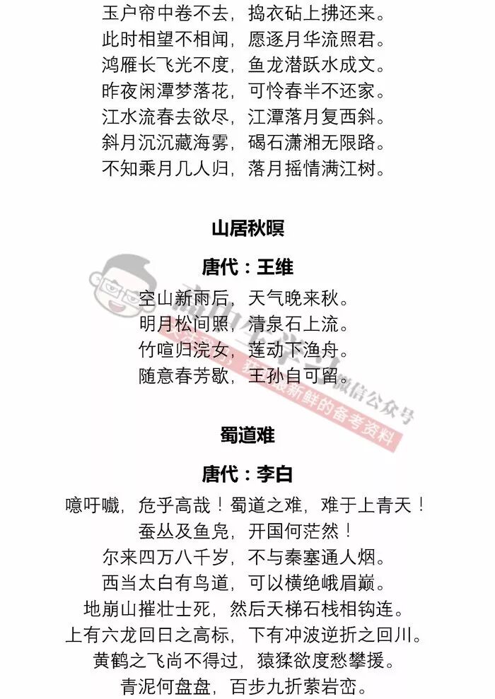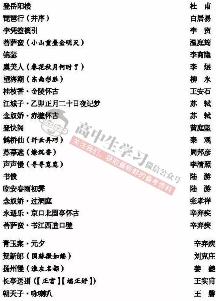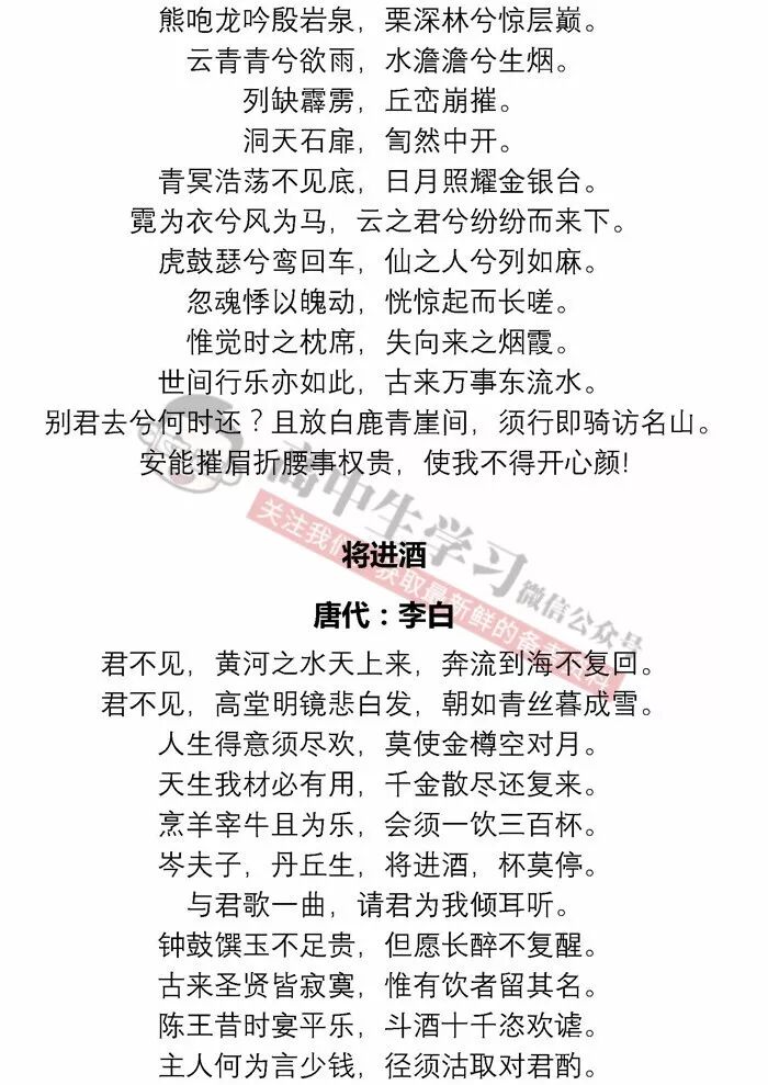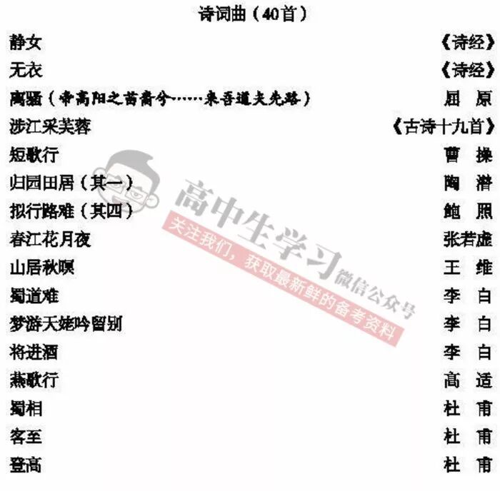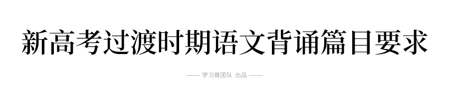 二、第三批综合改革试点省份中使用《普通高中语文课程标准(实验)版》的,参照《2019年普通高等学校招生全国统一考试大纲说明》,背诵篇目为64篇,包括义务教育课程标准7--9年级推荐篇目50篇和高中课程标准(实验版)推荐篇目14篇。